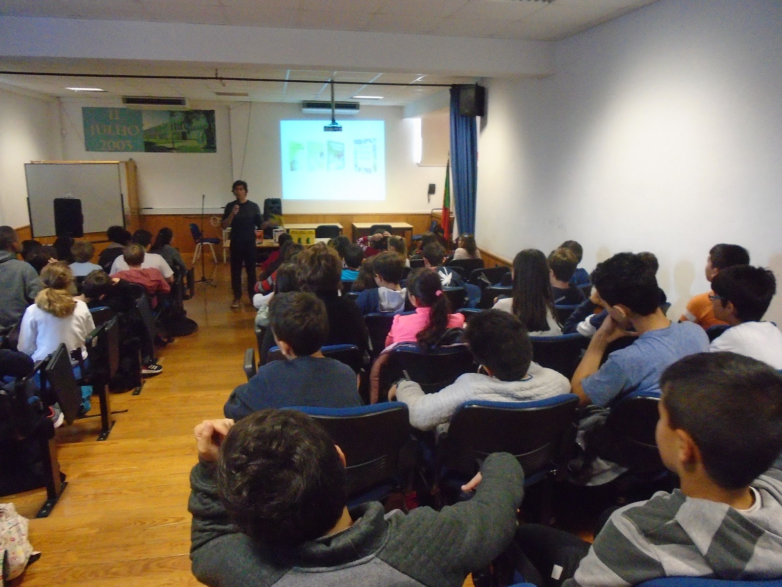 A biblioteca escolar organizou, no passado dia 15 do corrente mês, um encontro de autor com o escritor Nuno Matos Valente, que apresentou a sua obra a uma plateia  constituída por alunos do 5º e do 6º ano. Um auditório completamente cheio, escutou e aplaudiu a explicação e as dicas do autor. Quem sabe se no futuro não teremos algum escritor(a) deste grupo de espetadores?!